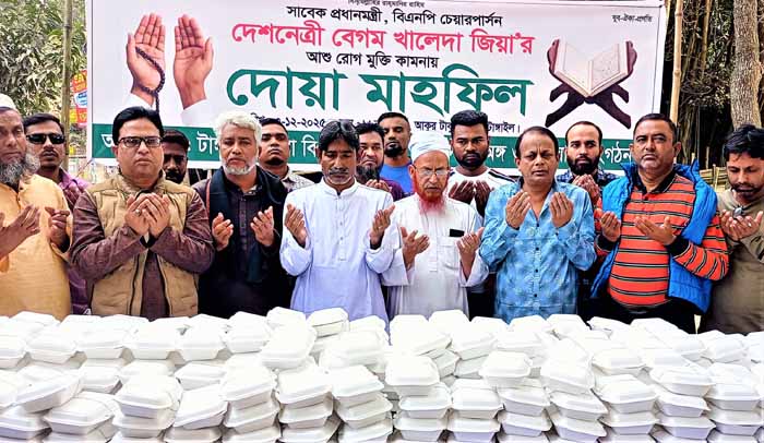 বিএনপি চেয়ারপার্সন সাবেক প্রধানমন্ত্রী বেগম খালেদা জিয়ার আশু রোগমুক্তি কামনায় টাঙ্গাইলে দোয়া মাহফিল এবং রান্নাকরা খাবার বিতরণ করা হয়েছে। বুধবার(৩ ডিসেম্বর) বাদ যোহর টাঙ্গাইল শহরের ১৬নং ওয়ার্ড বিএনপি, যুবদল, ছাত্রদল এবং অঙ্গ ও সহযোগী সংগঠনের উদ্যোগে ওই আয়োজন করা হয়। এতে প্রধান অতিথি ছিলেন, টাঙ্গাইল-৫ (সদর) আসনে দলীয় মনোনয়ন প্রত্যাশী জেলা বিএনপির সাধারণ সম্পাদক ফরহাদ ইকবাল।