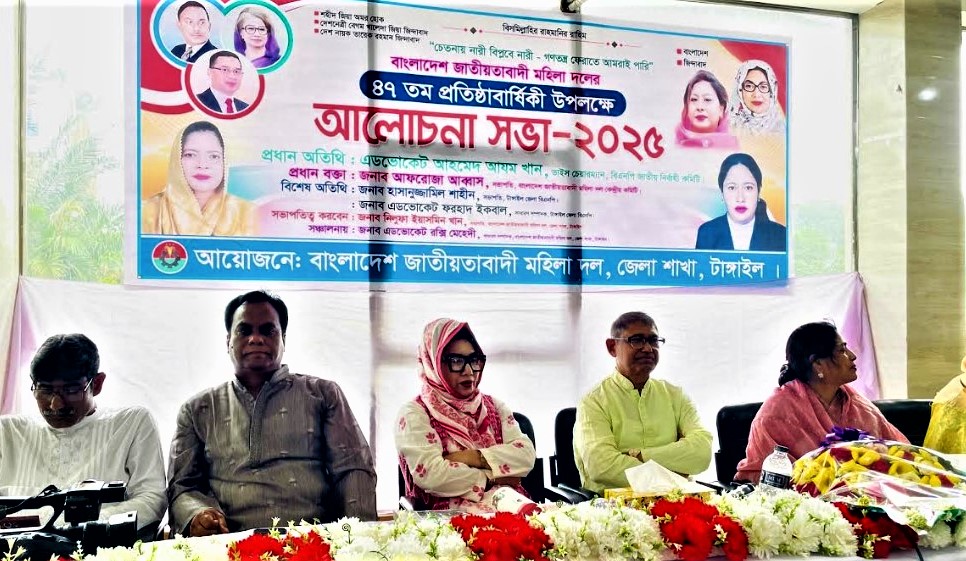 টাঙ্গাইলে জাতীয়তাবাদী মহিলা দলের ৪৭তম প্রতিষ্ঠাবার্ষিকী উপলক্ষে টাঙ্গাইল প্রেসক্লাব অডিটরিয়ামে আলোচনা সভা অনুষ্ঠিত হয়েছে। রোববার (২১ সেপ্টেম্বর) দুপুরে জেলা মহিলা দলের প্রতিষ্ঠাবার্ষিকীর আলোচনা সভায় প্রধান অতিথি ছিলেন, বিএনপির জাতীয় নির্বাহী কমিটির ভাইস চেয়ারম্যান অ্যাডভোকেট আহমেদ আযম খান। প্রধান বক্তা ছিলেন, জাতীয়তাবাদী মহিলা দলের কেন্দ্রীয় কমিটির সভাপতি আফরোজা আব্বাস।