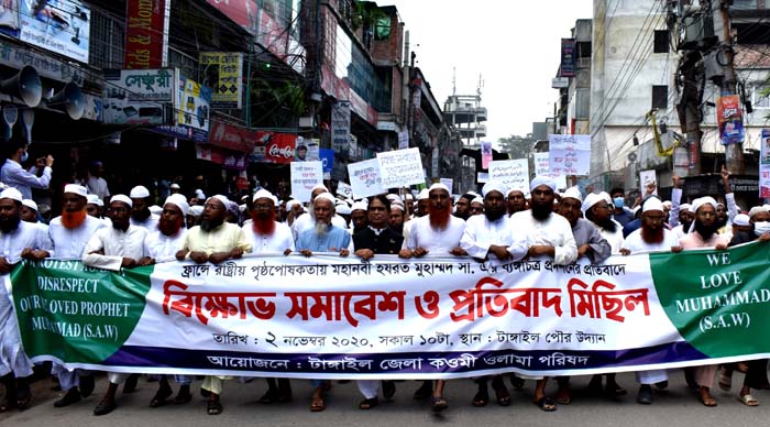 ফ্রান্সে রাষ্ট্রীয় পৃষ্ঠপোষকতায় বিশ্বনবী হযরত মুহাম্মদ(সা.) এর ব্যঙ্গচিত্র প্রদর্শনের প্রতিবাদ ও ফ্রান্সের সকল পণ্য নিষিদ্ধের দাবিতে টাঙ্গাইলে বিক্ষোভ সমাবেশ ও প্রতিবাদ মিছিল করেছে টাঙ্গাইল জেলা কওমী ওলামা পরিষদ।