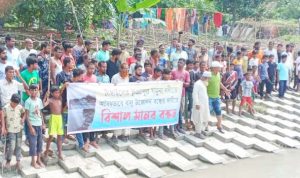 যমুনায় বালু উত্তোলন বন্ধে লাঠি ও ঝাঁড়ু হাতে এলাকাবাসীর মানববন্ধন